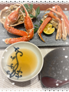 とても楽しみにしていた日です。長い長いお時間のお付き合いを頂き、ありがとうございました。 ご指名様とお部屋でゆっくりの後は、ランチデートへ出掛けます。今日は寒くなり風はありましたが、日差しが出る時間もありました。昼間、街を歩くのには過ごしやすく気持ちの良い1日に感じます。 本ずわい蟹を食べるのは初めてです。蟹料理のお店では、これから調理をする蟹を見せて下さります。とても楽しみです。ゆっくりと会話をしながら笑顔を交わせる時間は、最高に至福を感じます。蟹のコースなので、特に印象に残ったものを載せてみます。 「茹でずわい蟹」塩気があるのでそのままでも美味しいですが、「かに酢」で頂きます。