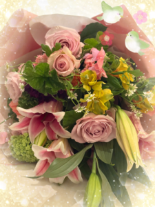 こんばんはお忙しい中にお時間を作って下さり、ご指名様方本当にありがとうございました。皆様の笑顔に支えて頂き、嬉しくて幸せな時間を過ごすことができました。 お優しいご指名様からお菓子と「お気持ち」を頂きました。「ホワイトデーが近いから!」とのことです。感激です!!お心遣いに感謝致します。楽しいお時間は、いつもですが本当にあっという間に過ぎました。お仕事では、「転機」がありそうですね。また、ご指名様の近況を伺うのが楽しみとなりました。次回を待ち遠しく、心待ちにしております。   また素晴らしい「花束」と出迎えて下さりましたご指名様がいらっしゃいます。スノーボール、スイートピー、薔薇は2種類、カーネーション、百合は八重と一重、ラナンキュラス、ローズゼラニウム等々〜。今回は大きくてダイナミックな百合を中心としたアレンジです。元気の出る花束を本当にありがとうございました。 スイーツを頂くお時間もありました。 桜のムースがとても美味しかったです。ご馳走様でした。ご指名様は、長い長いお時間、ずっと紳士的に接して下さりました。ありがとうございました。  小嶋美玲